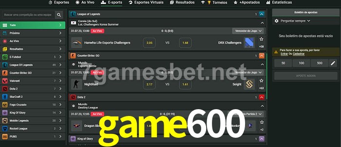 O game600 oferece uma grande seleção de opções de apostas em e-sports com probabilidades competitivas